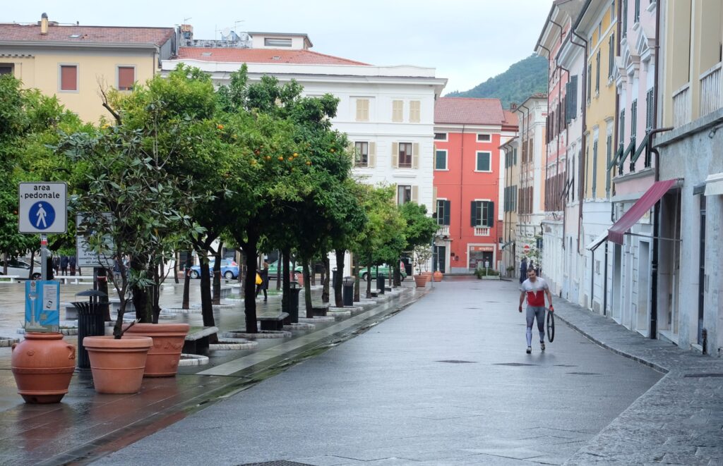 Piazza degli Aranci on apelsinipuudega ümbritsetud (arancio – apelsinipuu) väljak Massa südalinnas. Tema lõunapoolset külge ääristab imekaunis barokk stiilis puna-valge Palazzo Ducale ehk hertsogipalee. Sel hommikul kell 8 võõrustas see väljak 527 ratturit 20 erinevast riigist. Olles väga täpne, siis kell 8.00 ootasid Grand Depart’i 525 ratturit. Sest meie Katiga jäime hiljaks. Sattusime hotellipidaja perega sellisesse jutuhoogu, et lihtsalt ei olnud võimalik õigel ajal lahkuda. Rääkisime vaheldumisi oma peredest, mis on Itaalias väga oluline jututeema. Eriti kui juttu tuleb vanemastest või vanavanematest. Näitasime pilte suvisest Haapsalust, Kati kodukandist, mis mõjus pereemale väga võimsalt, sest tegu on ju armsa mereäärse väikelinnaga sarnaselt Massa-le. Kuuldes veel meie sanatooriumitest ja ravimudast, oli tädi lummatud.