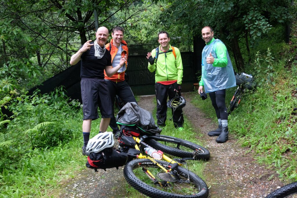 Kogu tänane teekond mägedes oli meie rattad katnud ühtlase mudakihiga ning laskumise ühel laugemal osal, kus kitsas kivine jalgrada asendus veidi laiema rajaga, avastasime mõnusa puhkepaiga oja kaldal, kus oli võimalik ka rattad ära puhastada. Sama võimalust olid kasutamas veel mõned ratturid. Rattapesu vahendeid meil muidugi ei olnud, kuid see-eest olid meil joogipudelid ja rattakindad – pudeliga vett peale ja kindaga muda maha. Perfetto!