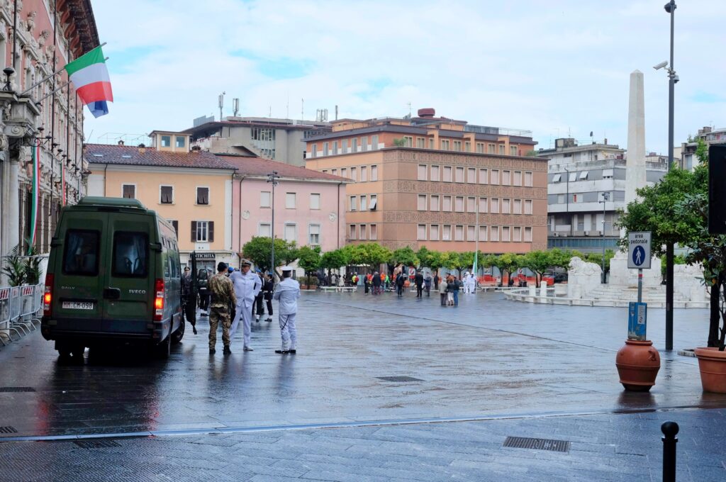 Väljak ei olnud siiski päris inimtühi. Mitmed ratturite grupid rääkisid elavalt veel juttu, osad sättisid oma varustust ja korraldajad vedasid telki väljakult minema. Toetasime oma rattad väljaku keskel asuva monumendi äärele, et hetkeks hinge tõmmata, mõned pildid teha, gps-id käima panna ja siis teele asuda. Saime just oma rattad väljaku keskpaika ehtiva ausamba kiviäärisele toetada kui astus ligi sõjaväe paraadmundris härrasmees ja palus viisakalt, kuid vastuvaidlemist mitte sallival toonil meil võtta oma rattad ja väljaku keskelt lahkuda. Selgus, et just täna on Festa della Republicca ehk vabariigi aastapäev, mida tähistatakse alates 1946. aastast kui veidi üle poole Itaalia kodanike otsustas vabariigi loomise ja monarhiast loobumise kasuks. Populaarne on seda päeva tähistada sõjaväeparaadiga ja just sellele me kippusime jalgu jääma.