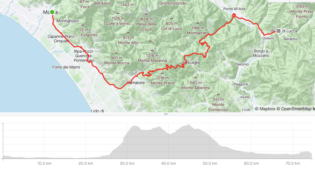 Meie ees ja taga, vahel ka meiega koos, liikus veel mitmeid Tuscany Trail logodega rattureid. Kõik liikusid omas tempos, kiiret polnud kuhugi. Teadsime, et esimesed 20 km on profiil tasane ja siis ootab meid eest Alpi Apuane mäeahelik, Itaalia keskmäestik. Kuna enne pole olnud au selle Põhja-Toskaanat läbiva mäeahelikuga lähemalt tutvuda, siis ei osanud midagi oodata. Kati ei osanud üldse midagi oodata, sest ta polnud elus enne rattaga ühestki tõsisest mäest üles sõitnud, nii et no stress! 5 km enne mäkke pööramist tegime Pietrasanta Sparis väikese peatuse, et tankida end Coca-Colaga. Koos poepeatusega olime 15 km siledat maad läbinud pooleteise tunniga, mis on tõeline linnas kruisimise tempo. Umbes sama kiirusega ma jooksen trennis tavaliselt, aga mis seal ikka, peaasi, et liigume. Ja ringi vaadata saime me palju, see oli eriti nauditav.