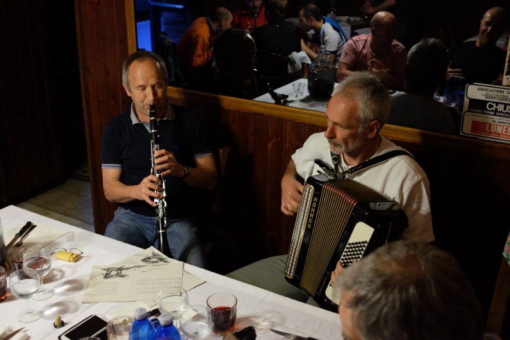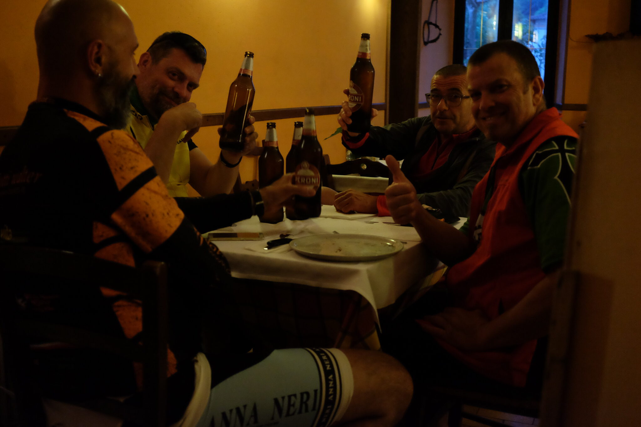 Kui hotelliga ei vedanud, siis restoraniga panime otse täkkesse. Restoraniomanik, kes ilmselgelt sellisel vihmasel õhtul erilist käivet ei lootnud, sai peale vestlust paari ratturiga aru, et tema restoranist võivad mööduvad ratturid leida õdusa peatuspaiga. Mees kutsus kohe poja appi, pizzaahi õnneks praksus hubaselt juba ja kõik lauad kahes söögisaalis said uued katted. Maja täitus ratturitest nii kiiresti, et hetkeks vaatasime isegi seda segadust muigega pealt, kuid kõik laabus perfektselt. Menüüsid ei olnud, peremees lendas mööda saali ringi ja vedas endaga kaasa puidust harkjalale kinnitatud paberilehte, kuhu oli kiiruga nimekiri toitudest kirjutatud. Hindu ei olnud, kõik eelroad ja põhitoidud olid ühes reas ning joogikaarti ei viitsinud keegi valmis kritseldada. Mida sa kirjutad kui küsida saab, eks? Esimese paarikümne minutiga olime sõbraks saanud kokaga, kes ka pidevalt saalis ringi jooksis ja kippus meile eriti tähelepanu pöörama, sest ta oli oma jutu järgi teeninud sõjaväes ja veetnud mingi aja ka Moskvas. Purssis üksikuid sõnu vene keelt ja tõi meile õllekõrvaseks kuuma pizzasaia oliiviõliga. Lõime pudeleid kokku ja hõikasime tervitusi kõrvallaudadega, kaks meest haarasid muusikariistad ja täitsid kõrtsi rahvaviisidega. Sõime kuumade kivide vahel küpsetatud kana koos röstitud kartulitega ning pizzat. Kokk andis vahepeal teada, et ta oli Vene luuraja omal ajal, mängisime kaasa ja naerda sai palju.