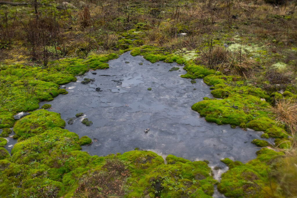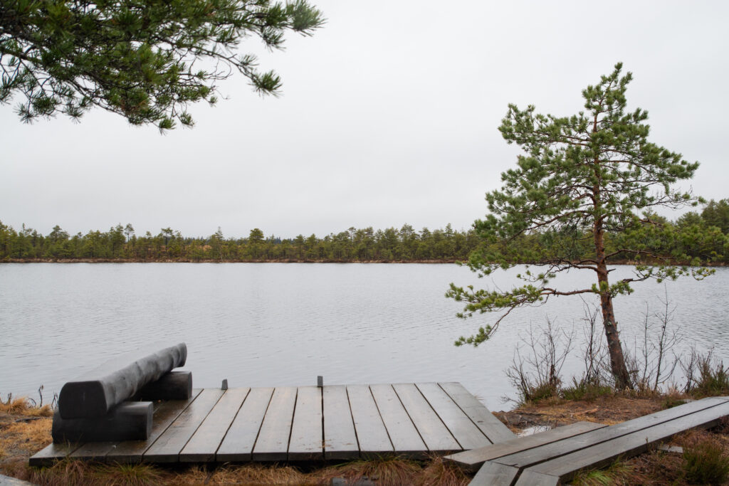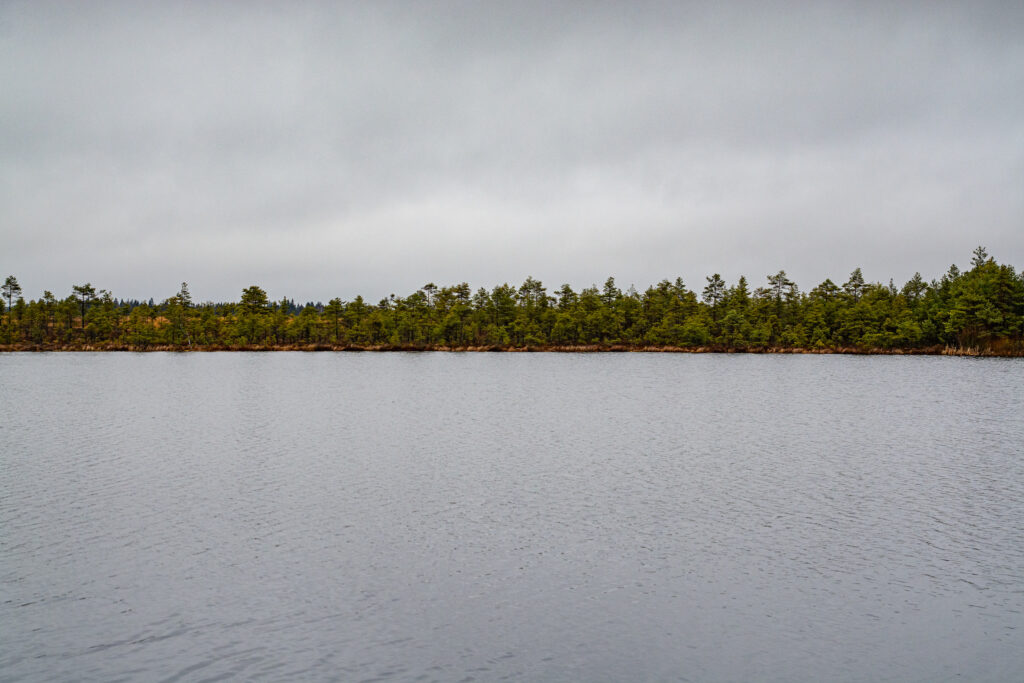 Järve ääres ametlik matkarada koos laudteega lõpeb, ent kaartide pealt on näha, et rada läheb edasi üle raba teisele poole metsa välja. Võtsin ka suuna sinnapoole. Alguses oli isegi rada ees, kuid see kadus peagi. Vaid üksikute vett täis valgunud jalajälgede järgi oli näha, et keegi on seal ilmselt millalgi kõndinud. Väga märg oli ja pidin hoolsalt valima mättaid ja kõrgemaid kohti, et mitte vette sattuda. Ümbrus muutus väga kiiresti ühetaoliseks ja ümberringi vaadates ei saanud enam üldse aru kust ma tulnud olin või kuhupoole võiks jääda järv.