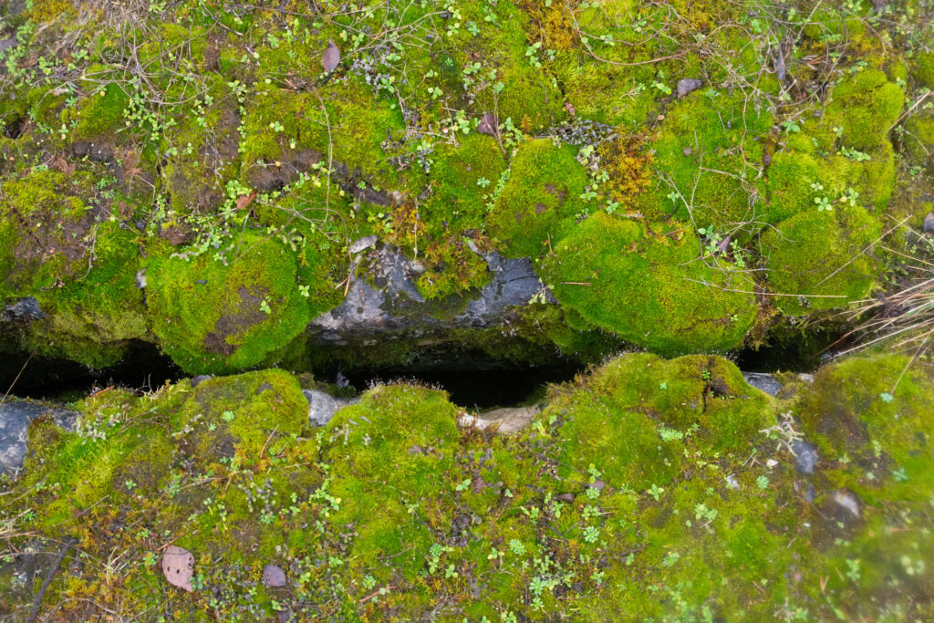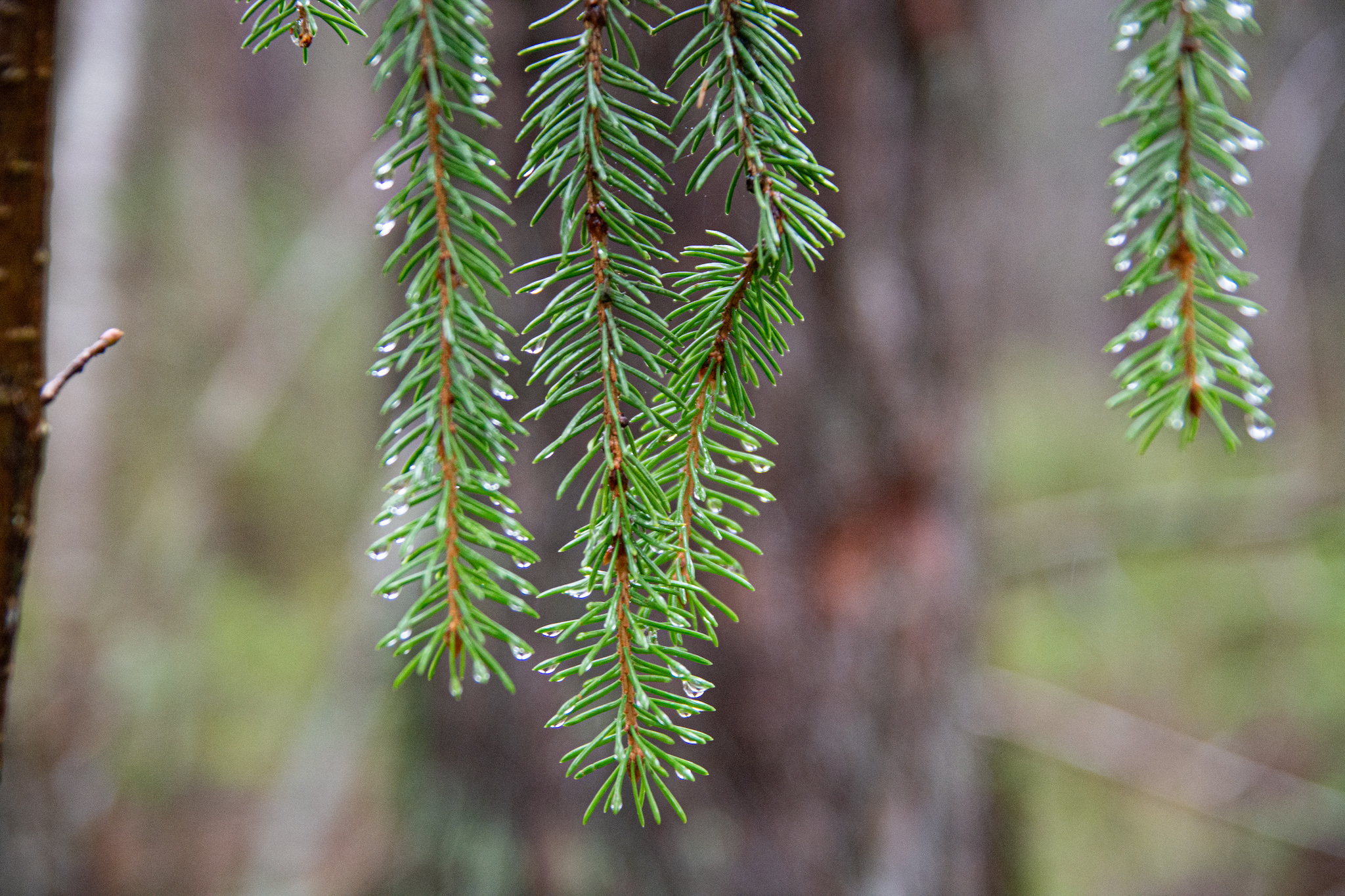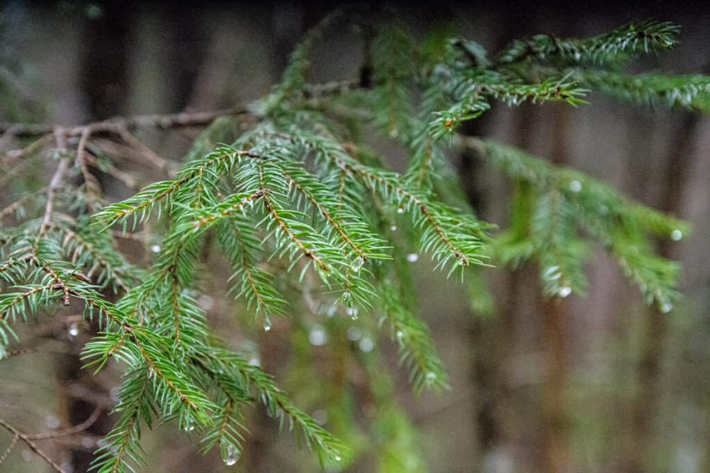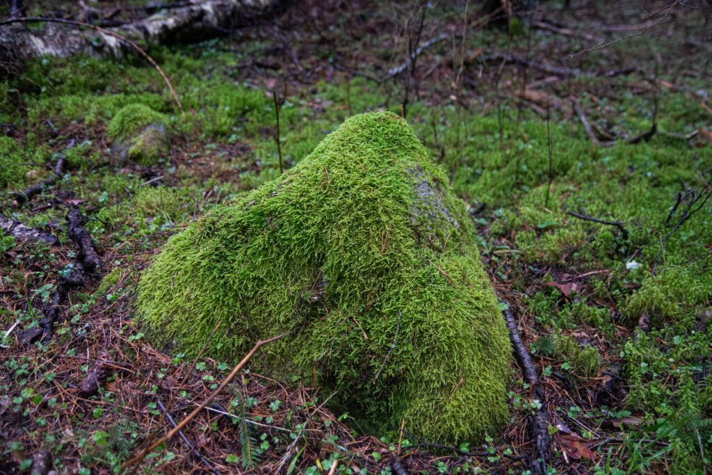 Metsaalune oli väga samblane, suvel võiks seal vist vabalt paljajalu ringi joosta. Paekivi on seal kandis väga maapinna lähedal ja metsas on näha isegi samblaga kaetud tillukesi paeastanguid. Ilus ja põnev maastik. Vihmasabin oli jätnud kuuseokstele veepiisad pärlendama, mis eemalt vaadates tundusid nagu väikesed sätendavad kristallid.
