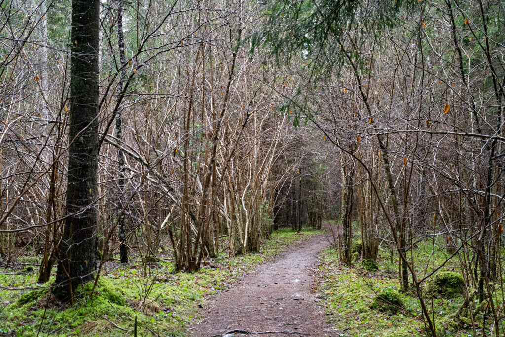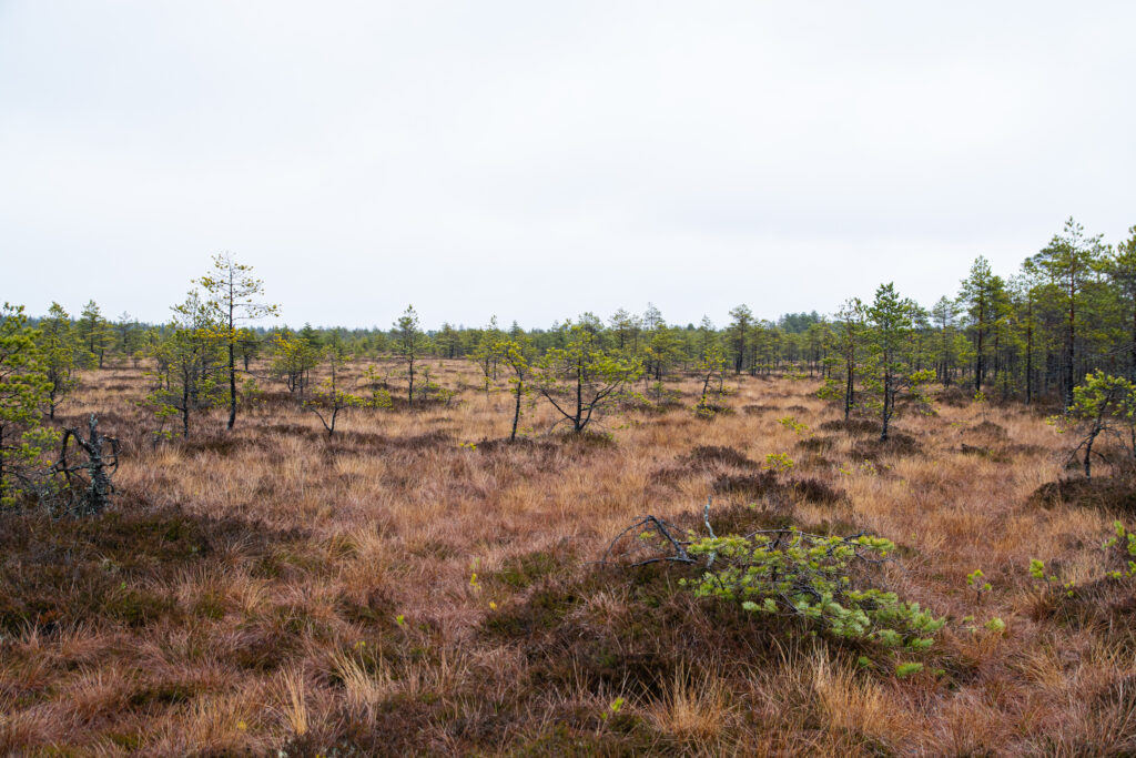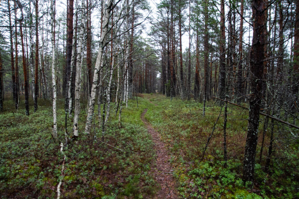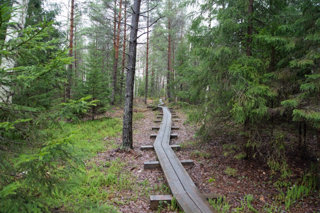 Kui heinamaa äär on läbi kõnnitud, tuleb enne rappa jõudmist läbida kitsas metsariba ja siit hakkab ka laudtee. See metsariba on üsna kitsas, kõnnid nagu läbi roheliste kardinate enne kui raba pruunikad toonid maastikul võimust võtma hakkavad.