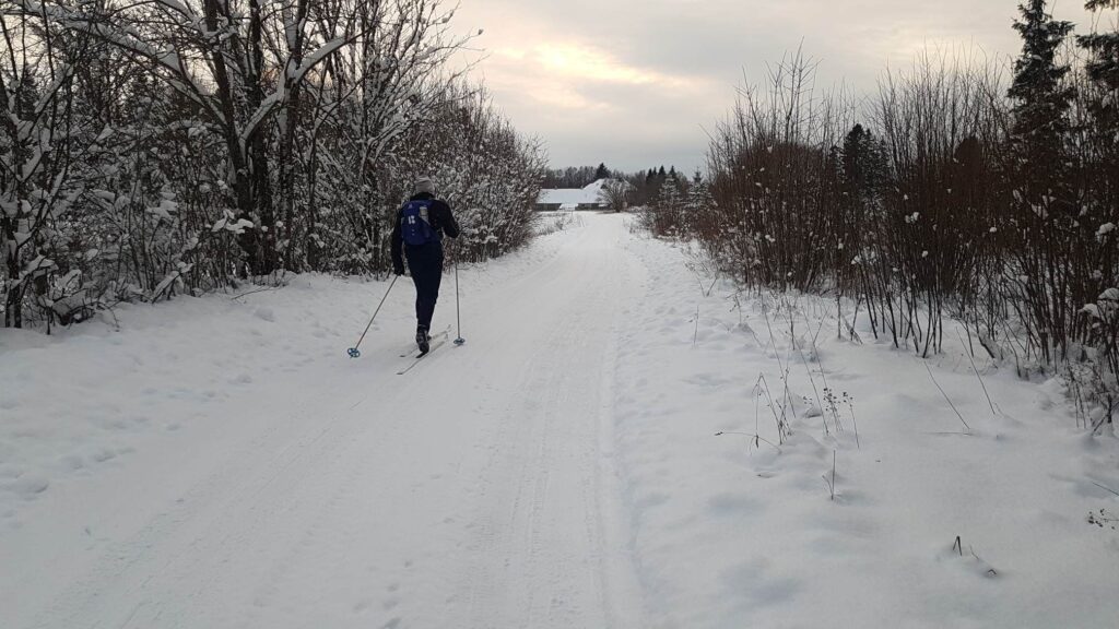 Viimased 6 km liigume hõreda liiklusega maantee ääres. See kant on üllatavalt huvitava profiiliga, lauged tõusud ja laskumised vahelduvad. Juba kisub hämaraks. Teeäärsete majade aknad helendavad juba kollakalt. Lõpuks jõuab väsimus ka kohale. Viimased pool kilomeetrit maanteelt Harvikeri mööblitööstuse prožektoritest valgustatud hoovile liigun juba tahtejõu najal, seda veel õnneks jätkub. 33 km näitab Strava. Keskmine kiirus 4.7 km/h. Koos peatustega pea 8 ja pool tundi, see on pea terve päev suuskadel.
