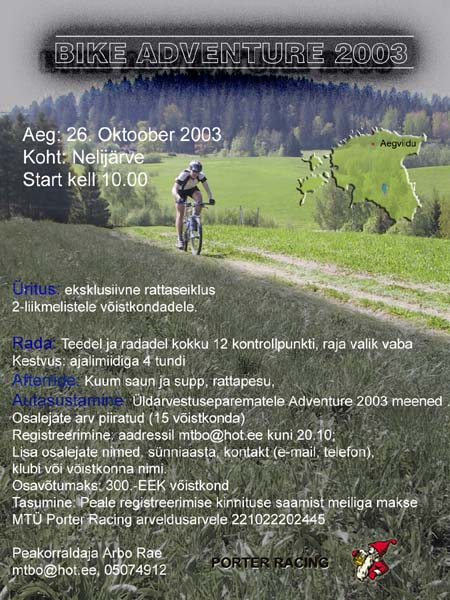 Nüüd, umbes poolteist nädalat tagasi, meenus mulle see jutuajamine ja küsisin Arbolt mis plaanid tal on? Esimene vastus oli et sel hooajal ikka ei jõua, ilmad läehvad külmaks, lumi tuleb jne. Peale paari maili vahetust aga ei suutnud Arbo ilmselt vastu panna kiusatusele minna metsa, panna rada maha, ajada kamp huvilisi kokku ja asi ära korraldada. Nii ilmuski ühel päeval velo.clubbersi foorumisse kuulutus pealkirja BIKE ADVENTURE 2003 all. Planeeritud oli 15 meeskonnaga võistlus, et korralduskulud ei läheks taevasse ja et säiliks “külavõistluse õhkkond” eesmärgiga testida sellist võistluse formaati. Kuulutus sai üles pandud neljapäeva keskpäeval. Reede hommikul helistas Arbo ja ütles, et kõik 15 kohta on broneeritud ning osalemissoove on veel lisaksi. Kiiresti jõudis kohale, et sügisel toimib sõna “adventure” paremini kui “kross”, “maraton” vms.