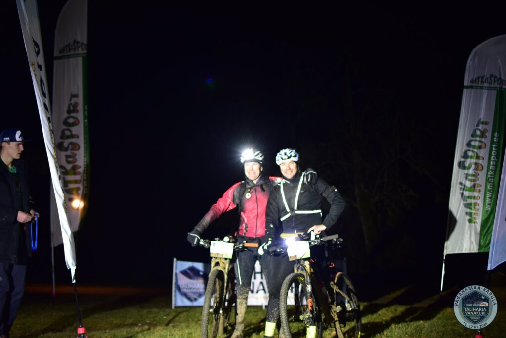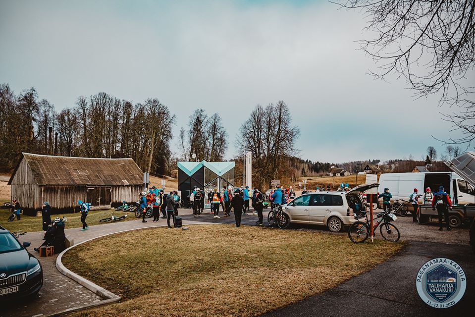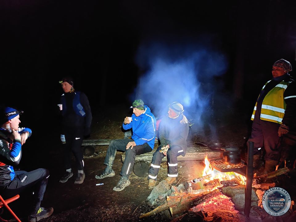 Tellingumäelt lahkudes lülitasin tule sisse ning minuga koos lahkus platsilt ka Madis. Olime läbinud 64 km ning järgmised 15 km olid üsna tuim tallamine. Tee käis väikeste põksudega üles alla ja tuli vaid jälgida, et kiiremates kurvides valgusvihus ratast täpselt juhtida suudaks. Metsatee oli nagu suvel, kõva ja kiire. 78. kilomeetril keerasime teelt kõrvale, kus väikese Alumati järve äärde oli toidupunkti üles seadnud mees, keda viimati kohtasin eelmisel Vanakurjal pakkumas sooja teed. Mees, kes nagu selgus elab Sauel, minust vaid 3 km kaugusel, oli metsas korraldanud üsna õdusa olemise. Pott oli täis kuumi lõkkelt tulnud vorste, joogivalik nagu parimates pop-up kohvikutes ning praginal põlev lõke peegeldas tagasi punakat kuma ümber lõkke seisjate nägudelt. Vaatamata sellele, et kohvikupidaja vabandas mõne kõrbenud sardelliotsa pärast, olid need liigagi head sel õndsal hetkel. Ühel hetkel põrnitsesime Madisega mõlemad vaikides elavat tuld ise samal ajal mahlast ja küpsenud sardelli mugides, kuni jaanuarikuine metsaõhk lõi mõistuse taas selgeks – tuleb hakata minema, muidu jäämegi siia ööd nautima. Liiga hea oli seal olla.