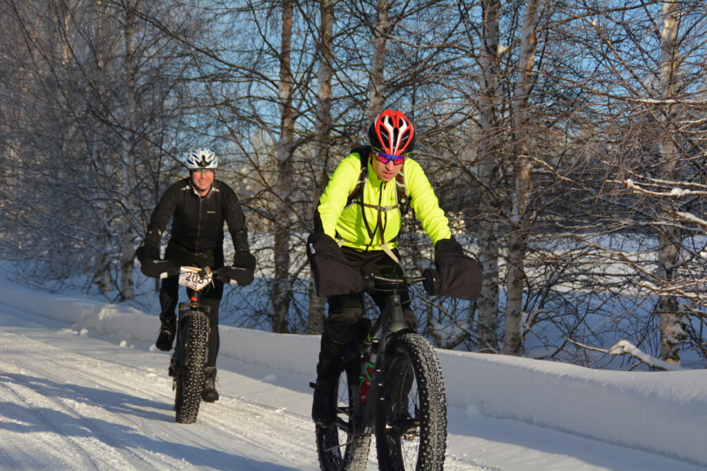 Panin ette 10 eurosed ehituspoest ostetud kaitseprillid, mida ma kasutan ainult talvistel külmadel sõitudel. Siis surusin käed lenksumuhvidesse ja tegin moe pärast rattaga enne starti ka ühe umbes 100 m ringi. Rahvas kogunes vaikselt starti ja korraldaja kordas uuesti üle, et esimesed 3 km on ametlikult rajalt viidud maanteele, sest see osa on liiga pehme rattaga sõitmiseks. See oli hea otsus, sest 3 kilomeetriga saab juba end soojaks sõita enne kui alustan tundmatu võrrandi lahendamist mitme muutujaga – ma ei ole kunagi enne sõitnud rajal, mis on saaniga pressitud teedeta maastikule. Lasin oma rehvid üsna tühjaks, manomeetrit käepärast polnud, kuid pakun huupi et kuskil 0,5 bar-i võis rehvirõhk olla. Peaks hakkama saama küll ja vajadusel võib tühjemaks lasta kui lumi ikka üldse ei kanna. Lisaks sellele panin seekord rattale nagadega kerged flat-pedaalid ja jalga tõmbasin soojad Salomoni lumesaapad. Kes hakkab sellise valiku puhul pead vangutama siis pean tunnistama, et selline variant ei ole lumises talvel kehvem kui tavaline clipless pedaal.