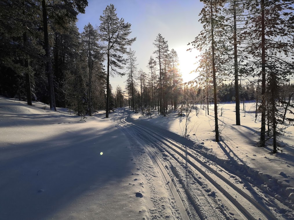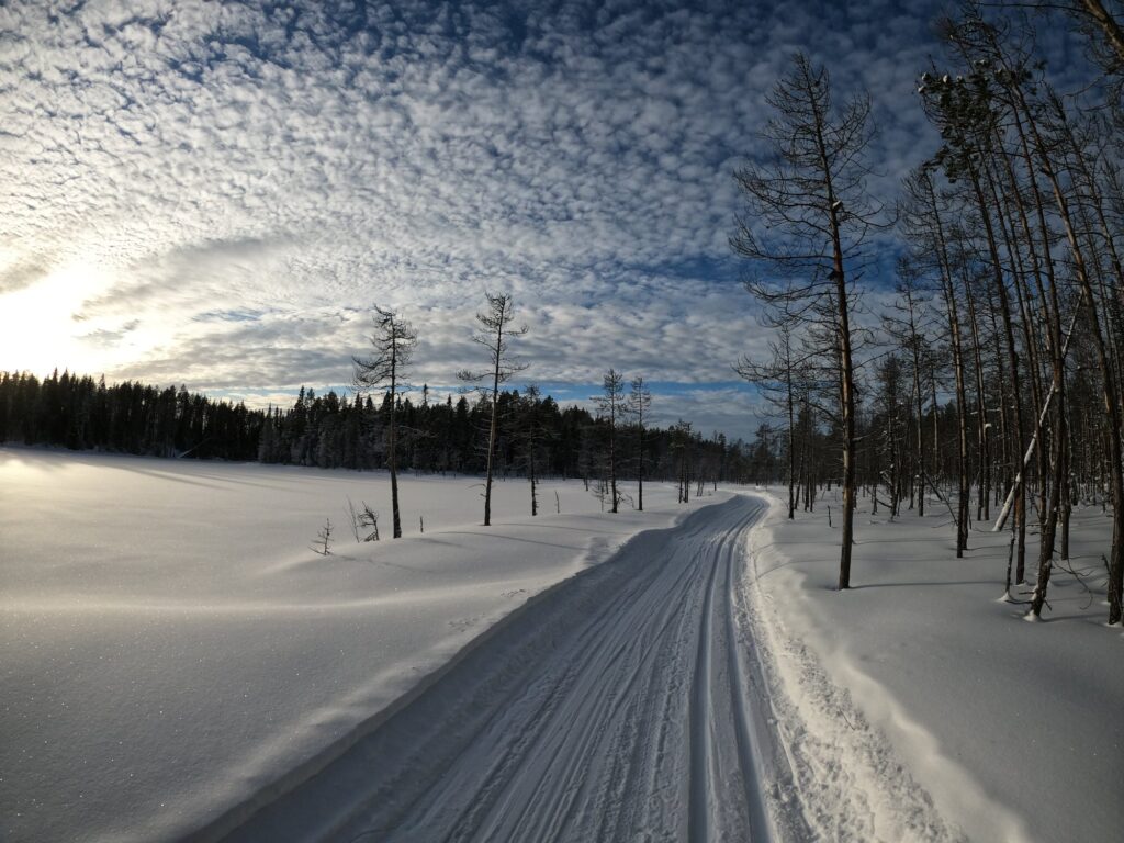 Kaks ratturit liikusid ees üsna kiires tempos ja peagi oli meie vahe paarsada meetrit. Mina liikusin oma tavalise tempoga, lihtsalt väntasin mõnuga, ei pingutanud. Ometigi jäi minu taha üsna kiiresti tükk tühja maad. Kui 3. kilomeetril pöörasime lumiselt maanteelt maha otse järvele, siis nii mu ees kui ka taga oli 300 meetrit tühja maad. Minust eespool sõitsid Kalle Koistinen ja Jukka Oikarinen, mõlemad kõvad spordimehed kui nende sotsiaalmeedia profiile vaadata. Üsna kiiresti sain aru, et saanijälg on täiesti sõidetav kui rehvirõhk on “õige” ja see andis enesekindlust. Kiirus järvel tiksus 16 – 20 km/h ilma suuremat jõudu kulutamata ja see andis lootust jõuda lõpuni ikka valges. Siledat järverada sai nautida 3.5 km, Kalle ja Jukka olid silmapiirilt juba kadunud. Hiljem live GPS-ist vaadates nägin, et eessõitnute kiirus oli minust 2-3 km/h kiirem ja kui ma väikseset kaldanõksust metsa keerasin, olid Jukka ja Kalle juba 600 meetrit eespool, kuid minu taga oli tühja maad veidi rohkem kui kilomeetrit. Saab üsna üksildane sõit tulema, mõtlesin ja mulle see sobis. Tulin ju nautima loodust, maastiku ja talve. Võidusõit ei mahtunud plaanidesse. Väikese eraldi kotiga oli raami küljes mu alaline kaaslane, väike Fuji fotokas, kuid pean juba ette ära ütlema, et sõidu jooksul ma ei puutunud seda kotti kordagi. See on tegelikult üsna kurb tagantjärgi mõeldes, ent kulgemine oli lumises Karjalas oli niivõrd mõnus, et kuidagi ei raatsinud seisma jääda, käsi soojast muhvist välja võtta ja fotograafiaga tegeleda. Kuigi ainest oleks olnud. Ja kuidas veel!