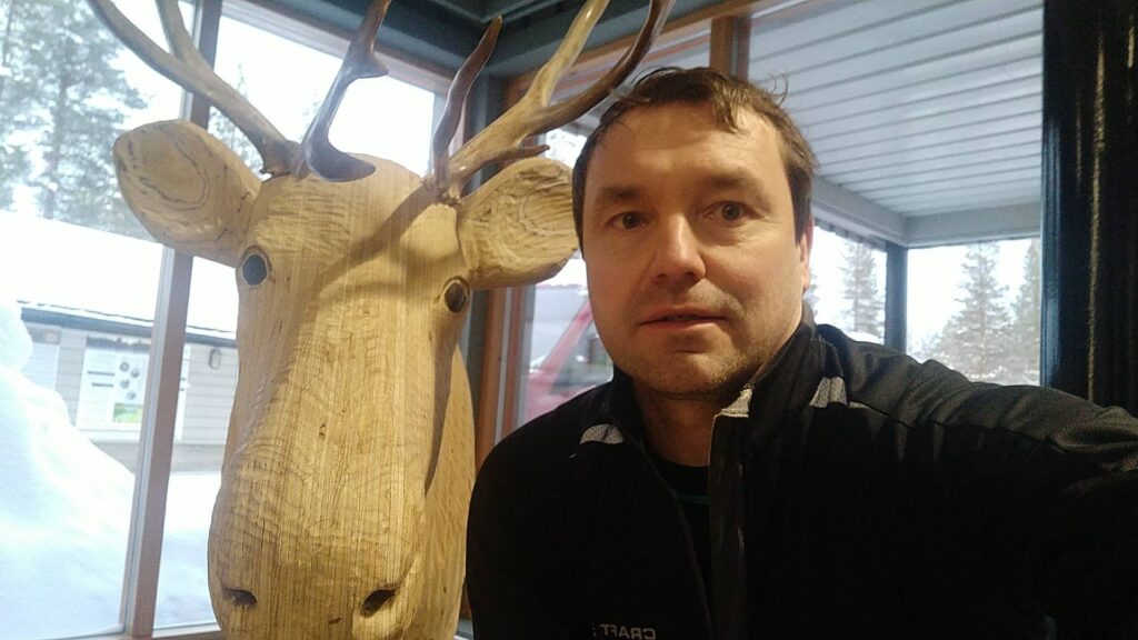 Stardipaika Hossa rahvuspargi külastuskeskusesse jõudsime umbes 45 min enne starti. Aega oli piisavalt, et sättida kõik sõiduvalmis. Keerukam osa ettevalmistusest oli vast seljakotiga joogipauna sättimine jaki alla – üsna kitsas tundub alati alguses siis olemine. Kuid stardihetkel õues olnud -8 külmakraadiga ei riski joogisüsteemi lahtiselt selga jätta. Lisaks joogikoti ja söögi paigutamisega jaki alla jõudsin veel vaadata keskuses veidi ringi, vestelda paari osavõtjaga, teha mõned pildid ning nautida suhkrusaia ja piimakohvi. Numbri kinnitasin ka lenksule ning enne õue minekut kallistasin puust põhjapõtra keskuse fuajees. Elusad põhjapõdrad jalutasid maantee kõrval umbes 10 km enne Hossat.