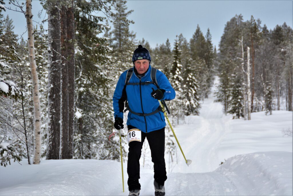 Palkhüti ukseavale toetus metsamehe riietes mees ja jälgis huviga kuidas ma põuetaskust küpsiseid otsisin. Mul oli taskus korralik kogus BelVita marjaküpsiseid, mida ennegi olen kasutanud. Head, pehmed ja toitvad küpsised. Mees uksel jälgis endiselt mind huviga ja mina nüüd juba teda ka, mugides samal ajal küpsist. Kumbki ei öelnud sõnakestki, lihtsalt vaatasime üksteisele otsa. See aeg tundus päris pikk niimoodi tõtt vaadata ja kui ma olin suu tühjaks söönud, tegin otsa lahti ja uurisin kuidas sel aastal talv siinkandis on. Sain üsna hea ülevaate kuidas talved siin viimastel aastatel kujunenud on. Viimase küpsisepuru leige spordijoogiga alla loputanud, sättisin end minekule. Jukka oli juba 8 km kaugusel ja Kalle minu ees umbes 2 km kaugusel. Minu selja taga, umbes 3 kaugusel, lähenes toitlustuspunktile Asmo Vuorenpää. Ei olnud just väga tihe liiklus, hingamisruumi oli. Keerasin lenksu järvekaldalt alla suunduvale rajale, Palosen järve jääle, millel ilutses silt “Pysy latu-uralla“.